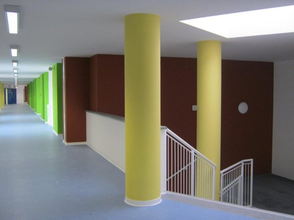 La localizzazione degli spazi tiene conto di fattori quali l’illuminazione naturale, la protezione da fonti di rumore esterne e la necessità di gestire le interferenze tra le diverse attività presenti in una scuola elementare. Impiantisticamente il fabbricato è dotato di impianto di riscaldamento a pannelli radianti alimentati da una centrale termica con generatori di calore a condensazione e gruppi di microcogegnerazione; è inoltre dotato di impianto di ventilazione meccanica per la corretta areazione delle aule e degli spazi comuni, di un impianto intelligente di gestione della luce, di impianto antincendio e di impianto fotovoltaico per la produzione di energia elettrica.